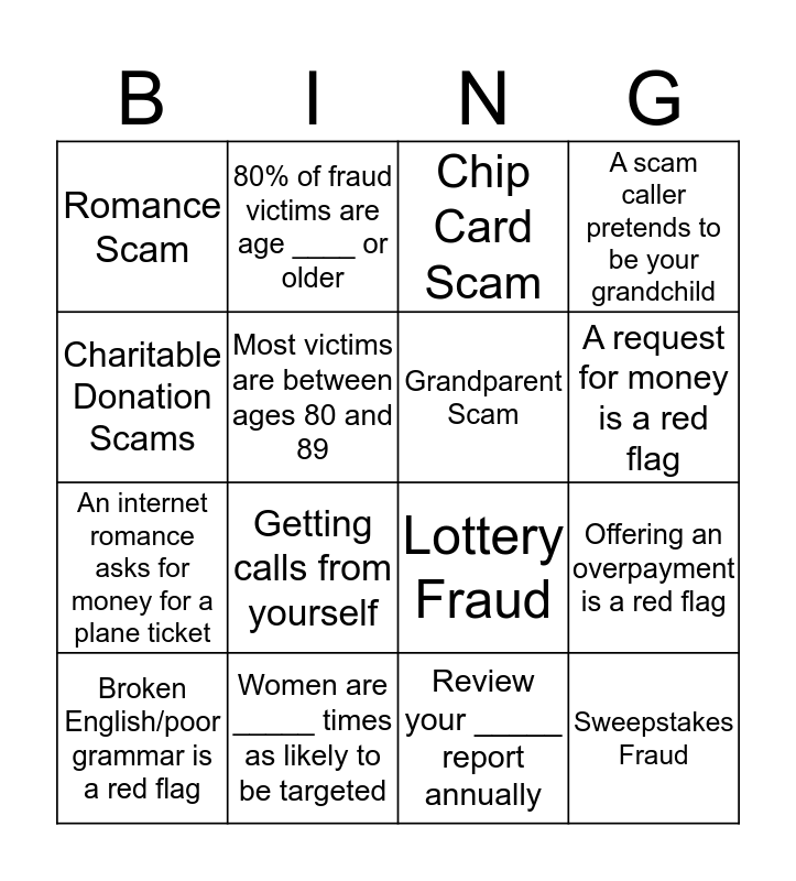 This bingo card has 22 words: Women are _____ times as likely to be targeted, Shred documents with personal information, 80% of fraud victims are age ____ or older, One in five adults age 65 and over has been a scam victim, Most victims are between ages 80 and 89, Grandparent Scam, Romance Scam, Chip Card Scam, Lottery Fraud, Sweepstakes Fraud, An internet romance asks for money for a plane ticket, A scam caller pretends to be your grandchild, Verify _________ by visiting 800helpfla.com, Someone says you won a prize, but need to pay fees, Review your _____ report annually, A scam caller tells you you’ve won an international lottery, Offering an overpayment is a red flag, Broken English/poor grammar is a red flag, Getting calls from yourself, Charitable Donation Scams, A request for money is a red flag and Use _______ that are difficult to guess but easy to remember.