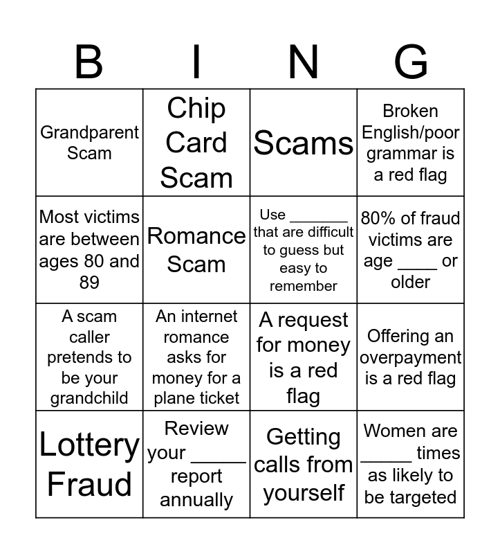 This bingo card has 23 words: Women are _____ times as likely to be targeted, Shred documents with personal information, 80% of fraud victims are age ____ or older, One in five adults age 65 and over has been a scam victim, Most victims are between ages 80 and 89, Grandparent Scam, Romance Scam, Chip Card Scam, Lottery Fraud, Sweepstakes Fraud, An internet romance asks for money for a plane ticket, A scam caller pretends to be your grandchild, Verify _________ by visiting 800helpfla.com, Someone says you won a prize, but need to pay fees, Review your _____ report annually, A scam caller tells you you’ve won an international lottery, Scams, A request for money is a red flag, Use _______ that are difficult to guess but easy to remember, Offering an overpayment is a red flag, Broken English/poor grammar is a red flag, Getting calls from yourself and Charitable Donation.