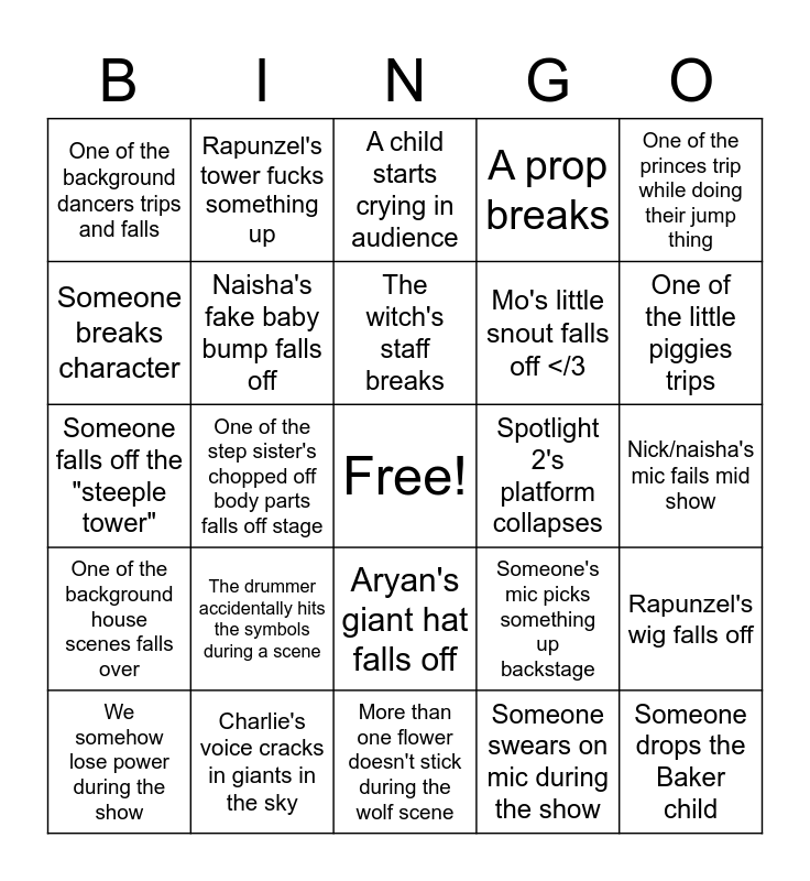 This bingo card has a free space and 24 words: The drummer accidentally hits the symbols during a scene, Charlie's voice cracks in giants in the sky, The witch's staff breaks, We somehow lose power during the show, One of the princes trip while doing their jump thing, One of the background dancers trips and falls, Someone breaks character, Rapunzel's tower fucks something up, Spotlight 2's platform collapses, Aryan's giant hat falls off, Mo's little snout falls off </3, Someone falls off the "steeple tower", Someone's mic picks something up backstage, Rapunzel's wig falls off, Naisha's fake baby bump falls off, Someone swears on mic during the show, Nick/naisha's mic fails mid show, A child starts crying in audience, One of the little piggies trips, One of the step sister's chopped off body parts falls off stage, Someone drops the Baker child, One of the background house scenes falls over, A prop breaks and More than one flower doesn't stick during the wolf scene.