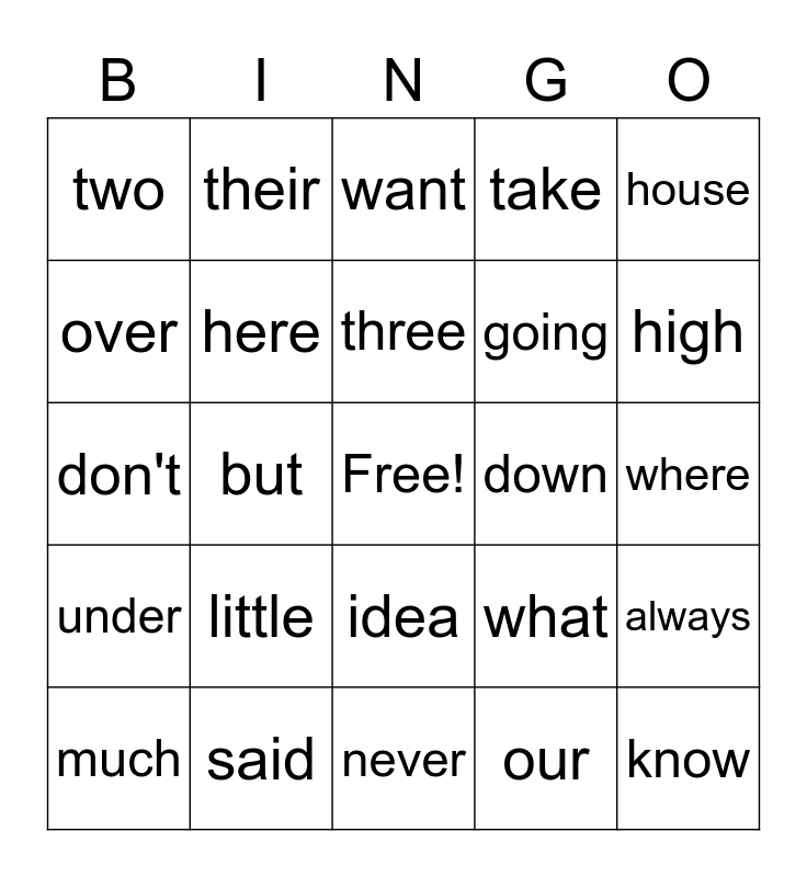 This bingo card has a free space and 24 words: little, said, three, much, house, two, over, their, down, idea, going, don't, what, always, here, our, where, want, high, but, know, under, take and never.