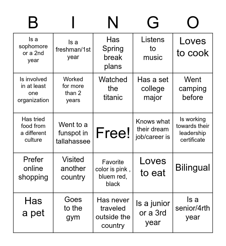 This bingo card has a free space and 24 words: Has a pet, Visited another country, Watched the titanic, Is a junior or a 3rd year, Loves to cook, Is a sophomore or a 2nd year, Is a freshman/1st year, Has Spring break plans, Knows what their dream job/career is, Is working towards their leadership certificate, Has tried food from a different culture, Worked for more than 2 years, Loves to eat, Bilingual, Is involved in at least one organization, Goes to the gym, Has never traveled outside the country, Listens to music, Went camping before, Prefer online shopping, Went to a funspot in tallahassee, Favorite color is pink , bluem red, black, Has a set college major and Is a senior/4rth year.
