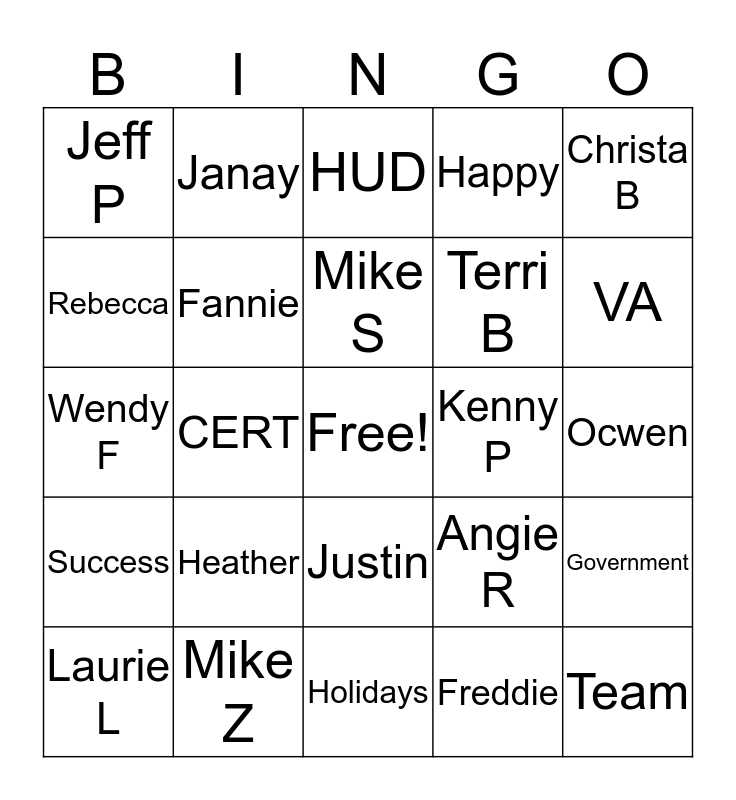 This bingo card has a free space and 24 words: Heather, Mike Z, Mike S, Laurie L, Christa B, Jeff P, Rebecca, Janay, Kenny P, Justin, Terri B, Wendy F, Angie R, Government, Fannie, Freddie, Ocwen, HUD, VA, CERT, Team, Success, Happy and Holidays.