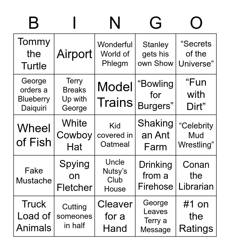 This bingo card has 35 words: Beverly Hillbillies, Animation, GUN!, Terry Breaks Up with George, Uncle Nutsy’s Club House, Stanley gets his own Show, George orders a Blueberry Daiquiri, Watching Stanley’s Show at the Bar, Model Trains, Eating Grapes, Wheel of Fish, “Secrets of the Universe”, ANTI-Free!, Raul’s Wild Kingdom, Tommy the Turtle, Shaking an Ant Farm, George Leaves Terry a Message, White Cowboy Hat, Fake Mustache, Kid covered in Oatmeal, Drinking from a Firehose, Truck Load of Animals, Conan the Librarian, Cutting someones in half, Wonderful World of Phlegm, “Fun with Dirt”, #1 on the Ratings, “Stay fit with Mike and Spike”, “Bowling for Burgers”, “Celebrity Mud Wrestling”, “$75,000”, Cleaver for a Hand, Spying on Fletcher, Airport and “Wants some peanuts?”.