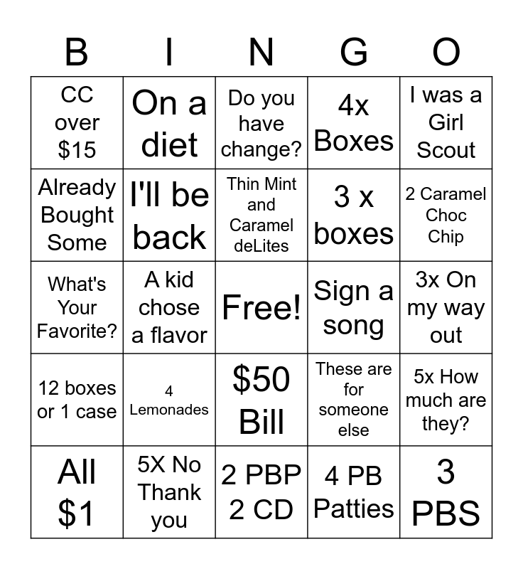 This bingo card has a free space and 24 words: 4 Lemonades, 5X No Thank you, Thin Mint and Caramel deLites, All $1, I was a Girl Scout, CC over $15, Already Bought Some, On a diet, Sign a song, $50 Bill, 3 x boxes, What's Your Favorite?, These are for someone else, 5x How much are they?, I'll be back, 4 PB Patties, 3x On my way out, Do you have change?, 2 Caramel Choc Chip, A kid chose a flavor, 3 PBS, 12 boxes or 1 case, 4x Boxes and 2 PBP 2 CD.