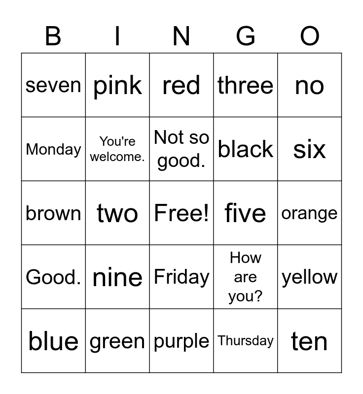 This bingo card has a free space and 36 words: Hello., Thank you!, Good-bye!, You're welcome., How are you?, Good., Not so good., yes, no, one, two, three, four, five, six, seven, eight, nine, ten, red, orange, yellow, green, blue, purple, pink, brown, white, black, Monday, Tuesday, Wednesday, Thursday, Friday, Saturday and Sunday.