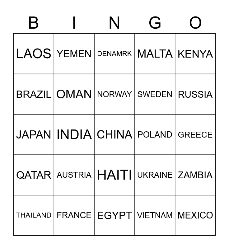 This bingo card has a free space and 24 words: AUSTRIA, FRANCE, NORWAY, THAILAND, KENYA, LAOS, BRAZIL, YEMEN, POLAND, HAITI, SWEDEN, JAPAN, UKRAINE, ZAMBIA, OMAN, VIETNAM, GREECE, DENAMRK, RUSSIA, INDIA, MEXICO, QATAR, MALTA and EGYPT.