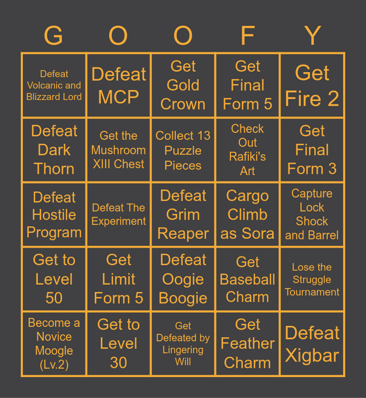 This bingo card has 1 images and 104 words: Get Cure 2, Get Cure 3, Get Fire 2, Get Fire 3, Get Blizzard 2, Get Blizzard 3, Get Reflect 2, Get Reflect 3, Get Magnet 2, Get Magnet 3, Get 3 Ansem Reports, Get 5 Ansem Reports, Get 7 Ansem Reports, Get Bronze Crown, Get Silver Crown, Get Gold Crown, Get 3 Torn Pages, Get Valor Form 3, Get Valor Form 5, Get Wisdom Form 3, Get Wisdom Form 5, Get Master Form 3, Get Master Form 5, Get Limit Form 3, Get Limit Form 5, Get Final Form 3, Get Final Form 5, Get 3 Orichalcum+, Get Lamp Charm, Get Baseball Charm, Get Feather Charm, Get Ukelele Charm, Get Olympus Stone, Get a Membership Card, Get a Money Pouch, Get No Experience, Get 13 Keyblades, Collect 13 Puzzle Pieces, Get to Level 30, Get to Level 40, Get to Level 50, Defeat Possessor (Door), Defeat Dark Thorn, Defeat Prison Keeper, Defeat Volcanic and Blizzard Lord, Defeat Storm Rider, Defeat Grim Reaper, Defeat Ground Shaker, Defeat Xigbar, Defeat Xaldin, Defeat Saix, Defeat Axel in STT, Defeat Demyx, Defeat Luxord, Defeat Roxas, Defeat Twilight Thorn, Defeat Cerberus, Defeat Genie Jafar, Defeat Oogie Boogie, Capture Lock Shock and Barrel, Defeat Beast, Defeat Hydra, Defeat Pete in the Past, Defeat Captain Barbossa, Chase Down Shenzi, Defeat Scar, Defeat MCP, Defeat Hostile Program, Defeat The Experiment, Get Defeated by Lingering Will, Win the Struggle Tournament, Defeat 1000 Heartless, Save Timon and Pumba, Defeat Hades, Visit Starry Hill, Defeat Xemnas 1, Grab Tifa's Chest, Become a Novice Moogle (Lv.2), Grab Gull Wing's Chest, Play Light Cycle Minigame, Complete one Atlantica musical, Play a Mushroom XIII minigame, Get the Mushroom XIII Chest, Deliver the Mail as Sora, Cargo Climb as Sora, Score 25 Points in Grandstander, Complete Poster Duty, Complete Bumble Buster, Complete Junk Sweep, Trigger Anti-Form, Complete any Skateboard Minigame, Acquire 11,000 or more munny, Acquire EXACTLY 420 munny, Lose the Struggle Tournament, Spin Timeless Pete, Do Any 3 Jobs As Sora, Equip Struggle Bat (You can do this now), Check Out Rafiki's Art, Buy something from the Peddler in Agrabah, Examine The Dart Board, Escort Abu Across The Street, Pegasus Neighs at You, Check Yourself out and Check Your Old Trophies.
