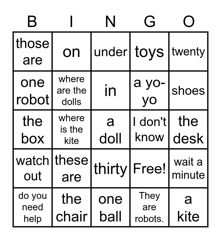 This bingo card has 25 words: these are, one ball, in, do you need help, twenty, those are, one robot, on, I don't know, thirty, a yo-yo, the box, Free!, wait a minute, where are the dolls, a kite, the desk, under, shoes, where is the kite, a doll, the chair, watch out, toys and They are robots..