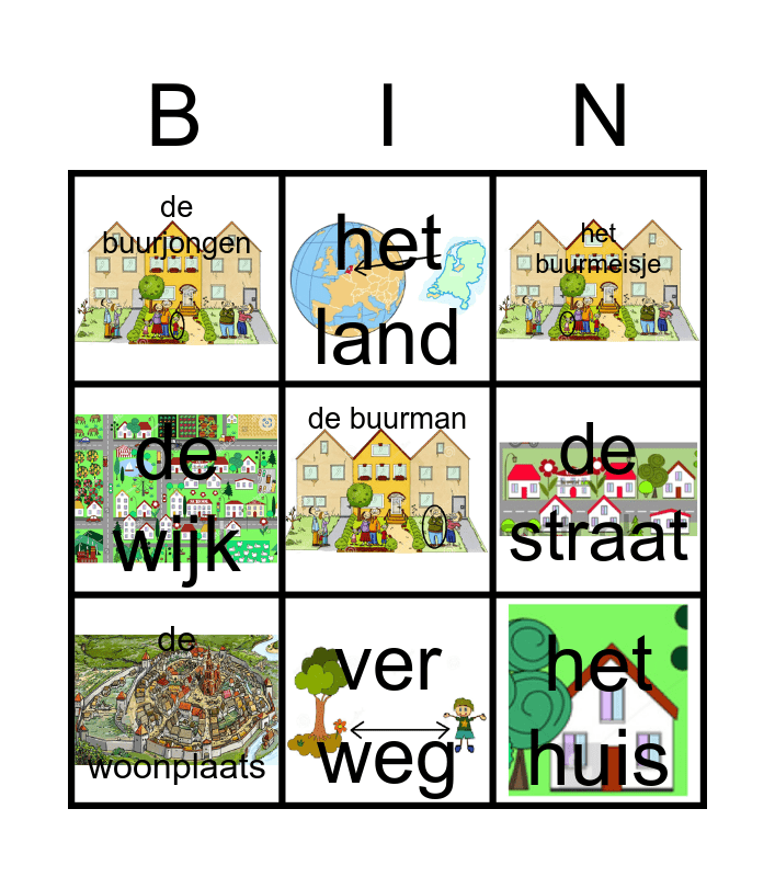 This bingo card has 12 images and 12 words: dichtbij, ver weg, het huis, de wijk, het land, de straat, de woonplaats, de buurvrouw, het buurmeisje, de buurjongen, de buurman and de buurt.