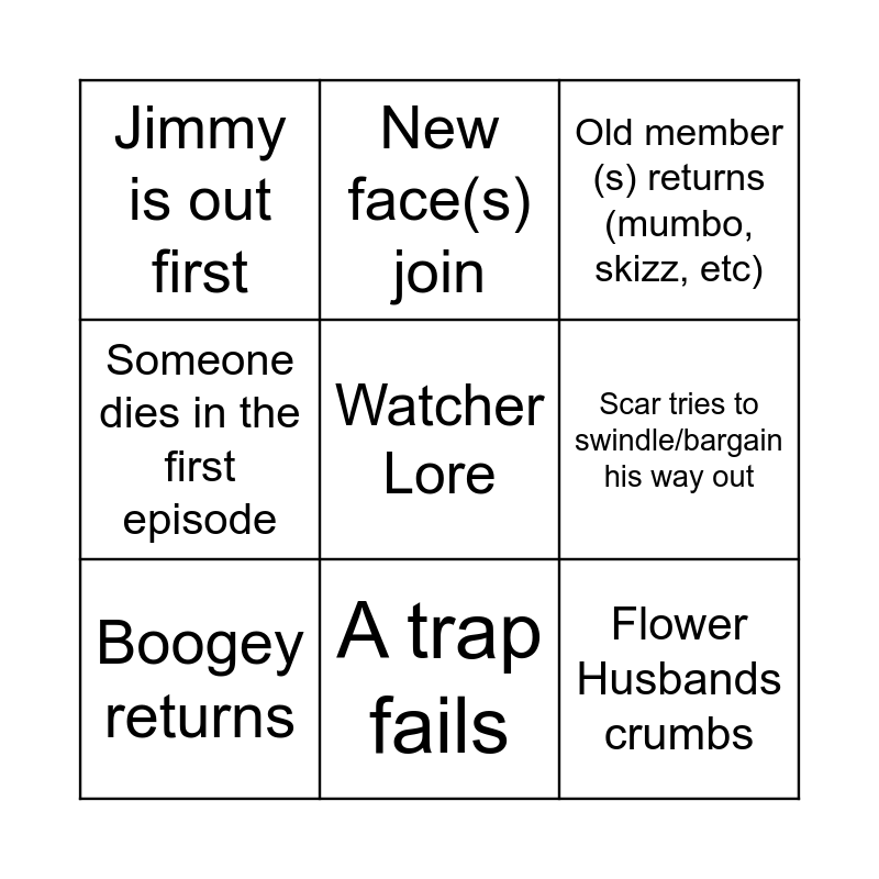 This bingo card has 9 words: Boogey returns, Old member (s) returns (mumbo, skizz, etc), New face(s) join, Someone dies in the first episode, Jimmy is out first, Scar tries to swindle/bargain his way out, Watcher Lore, Flower Husbands crumbs and A trap fails.