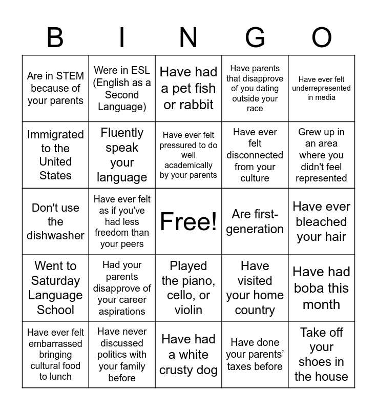 This bingo card has a free space and 24 words: Had your parents disapprove of your career aspirations, Have never discussed politics with your family before, Have ever felt pressured to do well academically by your parents, Have ever felt embarrassed bringing cultural food to lunch, Have ever felt underrepresented in media, Are in STEM because of your parents, Immigrated to the United States, Were in ESL (English as a Second Language), Are first-generation, Played the piano, cello, or violin, Have ever felt disconnected from your culture, Don't use the dishwasher, Have visited your home country, Have had boba this month, Fluently speak your language, Have done your parents’ taxes before, Have ever bleached your hair, Have had a pet fish or rabbit, Grew up in an area where you didn't feel represented, Have ever felt as if you've had less freedom than your peers, Take off your shoes in the house, Went to Saturday Language School, Have parents that disapprove of you dating outside your race and Have had a white crusty dog.