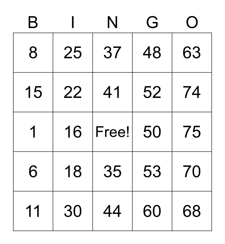This bingo card has a free space and 24 words: 11, 18, 41, 60, 63, 8, 25, 37, 50, 75, 1, 22, 53, 70, 15, 30, 44, 48, 74, 6, 16, 35, 52 and 68.
