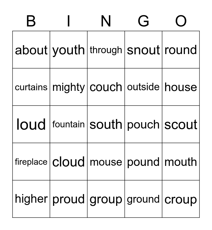 This bingo card has 25 words: cloud, group, couch, higher, round, about, curtains, youth, pouch, mouse, outside, loud, pound, mouth, mighty, croup, scout, through, house, fountain, south, proud, fireplace, snout and ground.