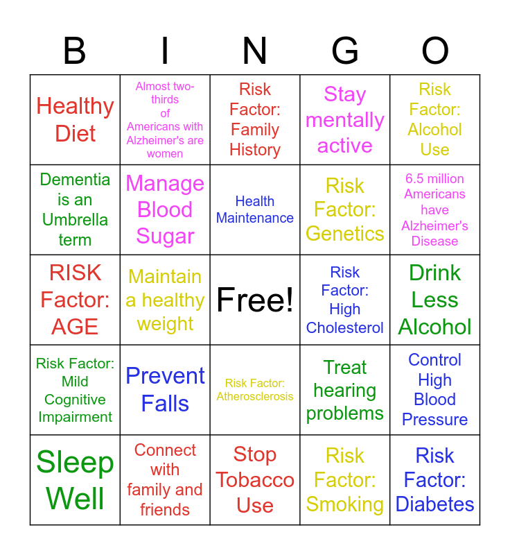 This bingo card has a free space and 24 words: Prevent Falls, Connect with family and friends, Health Maintenance, Sleep Well, Risk Factor: Alcohol Use, Healthy Diet, Dementia is an Umbrella term, Almost two-thirds of Americans with Alzheimer's are women, Risk Factor: High Cholesterol, Risk Factor: Atherosclerosis, Risk Factor: Genetics, RISK Factor: AGE, Treat hearing problems, Control High Blood Pressure, Manage Blood Sugar, Risk Factor: Smoking, Drink Less Alcohol, Risk Factor: Family History, 6.5 million Americans have Alzheimer's Disease, Maintain a healthy weight, Risk Factor: Diabetes, Risk Factor: Mild Cognitive Impairment, Stay mentally active and Stop Tobacco Use.