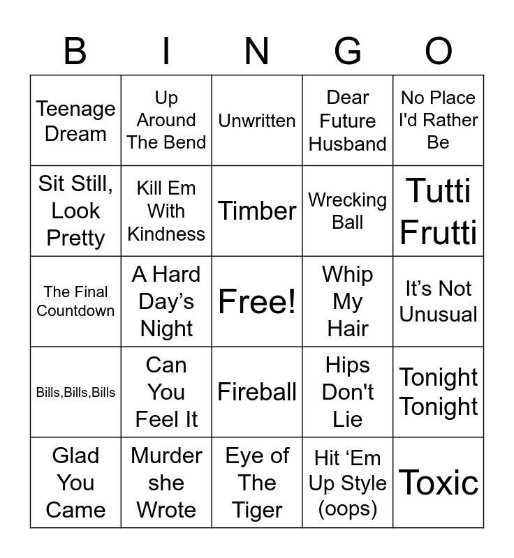 This bingo card has a free space and 61 words: Just a Cloud Away, Murder she Wrote, Made you Look, Bills,Bills,Bills, Hit ‘Em Up Style (oops), Just Fine, Kill Em With Kindness, Nonsense, Wrecking Ball, Brave, Dear Future Husband, Pretty Girl Rock, Sit Still, Look Pretty, I kNew You Were Trouble, Shower, Teenage Dream, Toxic, No Place I'd Rather Be, Troublemaker, Timber, Whip My Hair, Unwritten, Glad You Came, Tonight Tonight, Get Busy, Can’t Feel my Face, Rockabye, Wings, Tutti Frutti, Surfin’ Safari, A Little Less Conversation, Somebody That I Used To Know, 24k Magic, Safe And Sound, Up Around The Bend, Jump, I Like It, A Hard Day’s Night, Billie Jean, The Final Countdown, Dont Stop Belivien’, Can You Feel It, It’s Not Unusual, Disco Inferno, Hips Don't Lie, Umbrella, Roar, Heartbeat Song, The Sweet Escape, Fireball, Eye of The Tiger, Danger Zone, I wanna Rock, Barracuda, Super Bass, Yeah, Dancing Queen, Ice Ice Baby, Livin’ la Vida Loca, U Can’t Touch This and Who Let The Dogs Out.