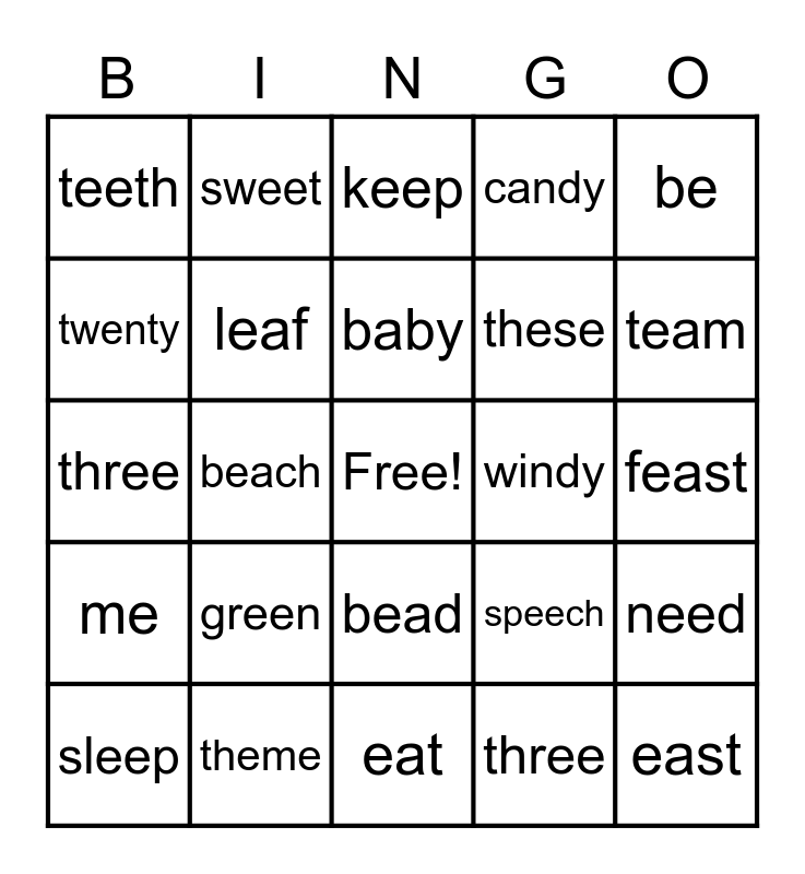 This bingo card has a free space and 29 words: sleep, she, beach, eve, teeth, keep, leaf, green, windy, theme, feast, east, eat, three, team, he, bead, me, be, three, speech, copy, these, twenty, candy, sweet, need, baby and beef.