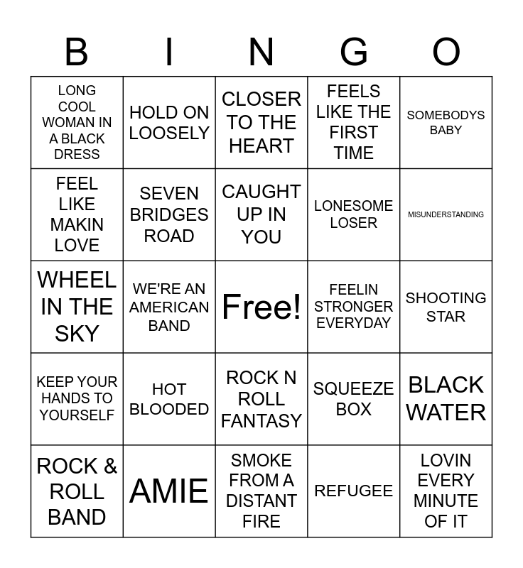 This bingo card has a free space and 65 words: THE LONG RUN, SWINGTOWN, LETS GO, BLACK WATER, BABY HOLD ON, LET IT RIDE, HOLD ON LOOSELY, TWO TICKETS TO PARADISE, CAUGHT UP IN YOU, SOME KIND OF WONDERFUL, ROCK N ROLL FANTASY, ROCKIN INTO THE NIGHT, SHOOTING STAR, SOMEBODYS BABY, DOUBLE VISION, FEEL LIKE MAKIN LOVE, WE'RE AN AMERICAN BAND, LONG COOL WOMAN IN A BLACK DRESS, DIRTY LAUNDRY, LONESOME LOSER, HOT BLOODED, KEEP YOUR HANDS TO YOURSELF, FEELS LIKE THE FIRST TIME, ROCK AND ROLL HOOCHIE KOO, LOVIN TOUCHIN SQUEEZIN, GIMME 3 STEPS, HER STRUT, MOVE IT ON OVER, LOVIN EVERY MINUTE OF IT, RAMBLIN MAN, ROCK & ROLL BAND, DANCE THE NIGHT AWAY, FOOL FOR THE CITY, MAGIC CARPET RIDE, SQUEEZE BOX, AMIE, RENEGADE, WHEEL IN THE SKY, REFUGEE, HEARD IT IN A LOVE SONG, SEVEN BRIDGES ROAD, SOUTHERN CROSS, FEELIN STRONGER EVERYDAY, CALL ME THE BREEZE, FLY LIKE AN EAGLE, RUNNING ON EMPTY, MISUNDERSTANDING, CHEVY VAN, MAMA TOLD ME NOT TO COME, LIDO SHUFFLE, BAD BAD LEROY BROWN, CUTS LIKE A KNIFE, JOY TO THE WORLD, SMOKE FROM A DISTANT FIRE, BLUE COLLAR MAN, HAIR OF THE DOG, ICE CREAM MAN, CLOSER TO THE HEART, LIGHTS, BLUE MORNING BLUE DAY, FEELIN SATISFIED, BOULEVARD, CROSSFIRE, HEY BABY and TWILIGHT ZONE.