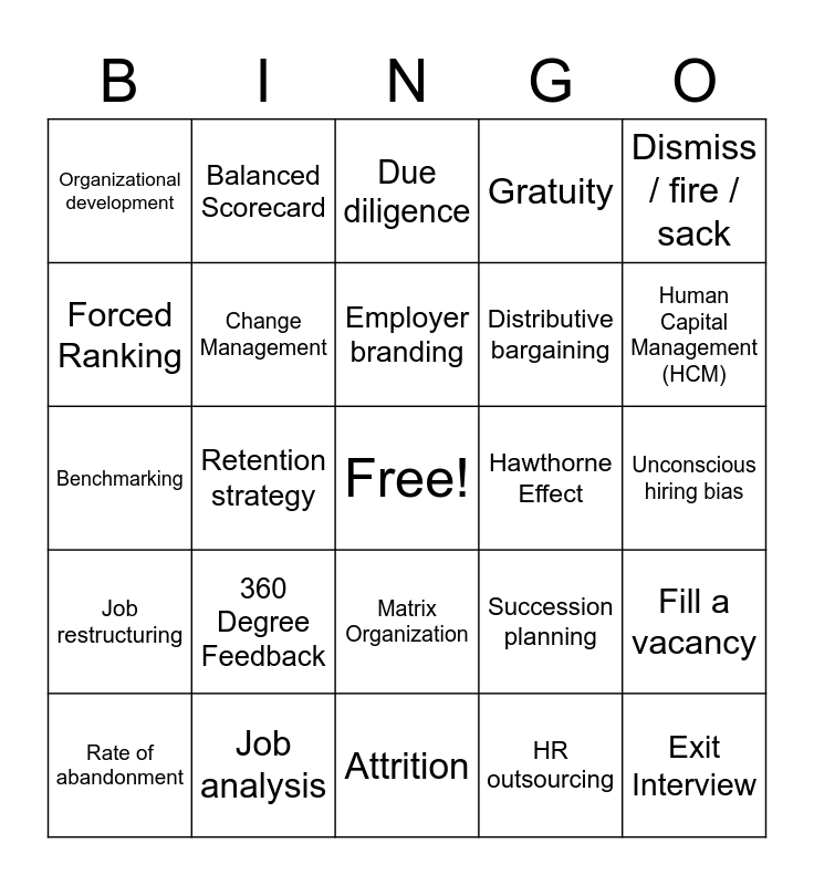 This bingo card has a free space and 24 words: 360 Degree Feedback, Job analysis, Employer branding, Rate of abandonment, Dismiss / fire / sack, Organizational development, Forced Ranking, Balanced Scorecard, Hawthorne Effect, Matrix Organization, Distributive bargaining, Benchmarking, Succession planning, Fill a vacancy, Change Management, HR outsourcing, Unconscious hiring bias, Due diligence, Human Capital Management (HCM), Retention strategy, Exit Interview, Job restructuring, Gratuity and Attrition.