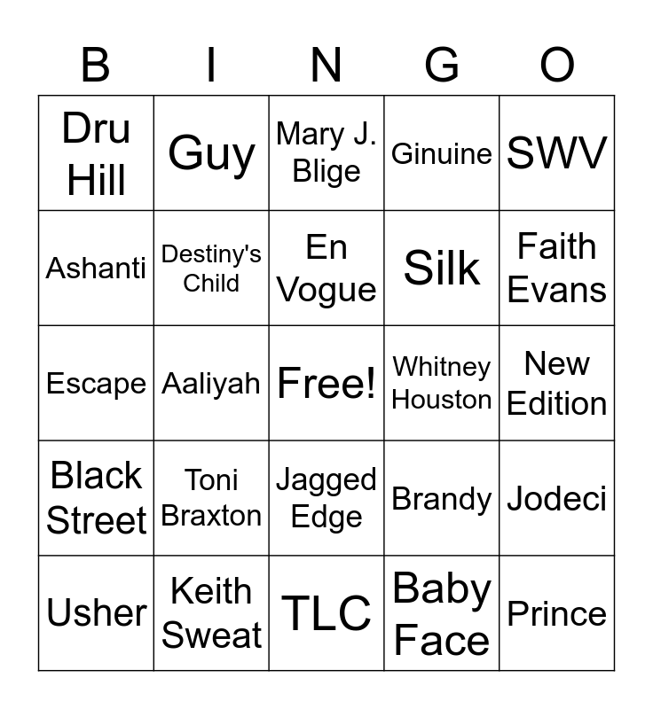 This bingo card has a free space and 24 words: Toni Braxton, Keith Sweat, En Vogue, Usher, SWV, Dru Hill, Ashanti, Guy, Whitney Houston, Jagged Edge, Silk, Escape, Brandy, Jodeci, Destiny's Child, Baby Face, New Edition, Mary J. Blige, Faith Evans, Aaliyah, Prince, Black Street, Ginuine and TLC.