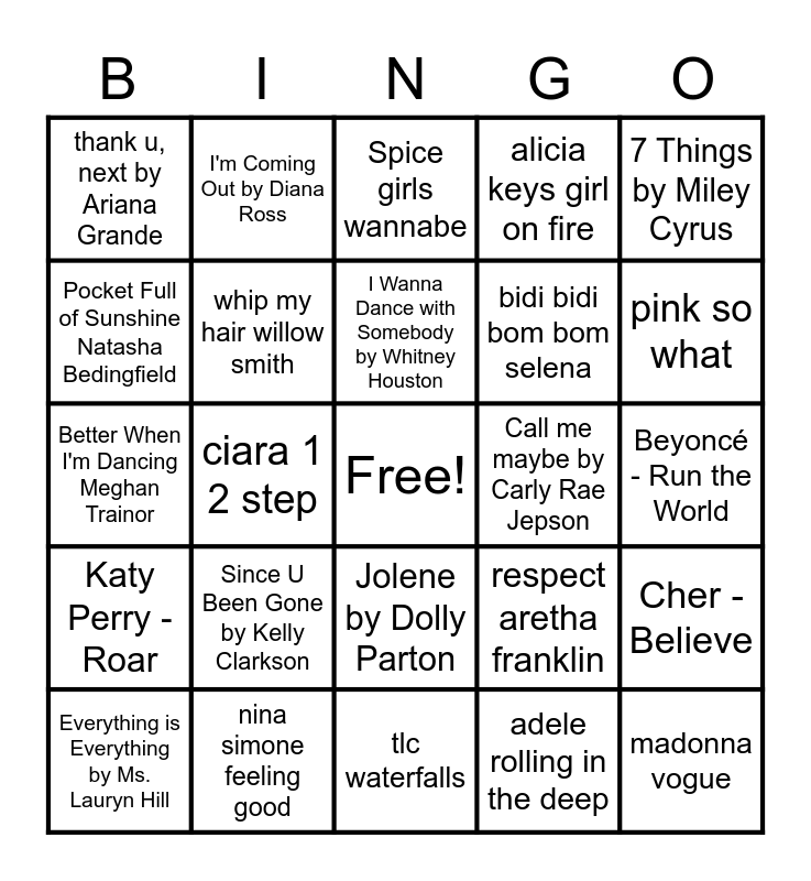 This bingo card has a free space and 24 words: Since U Been Gone by Kelly Clarkson, nina simone feeling good, I Wanna Dance with Somebody by Whitney Houston, Everything is Everything by Ms. Lauryn Hill, 7 Things by Miley Cyrus, thank u, next by Ariana Grande, Pocket Full of Sunshine Natasha Bedingfield, I'm Coming Out by Diana Ross, Call me maybe by Carly Rae Jepson, Jolene by Dolly Parton, bidi bidi bom bom selena, Better When I'm Dancing Meghan Trainor, respect aretha franklin, Cher - Believe, whip my hair willow smith, adele rolling in the deep, Beyoncé - Run the World, Spice girls wannabe, pink so what, ciara 1 2 step, madonna vogue, Katy Perry - Roar, alicia keys girl on fire and tlc waterfalls.
