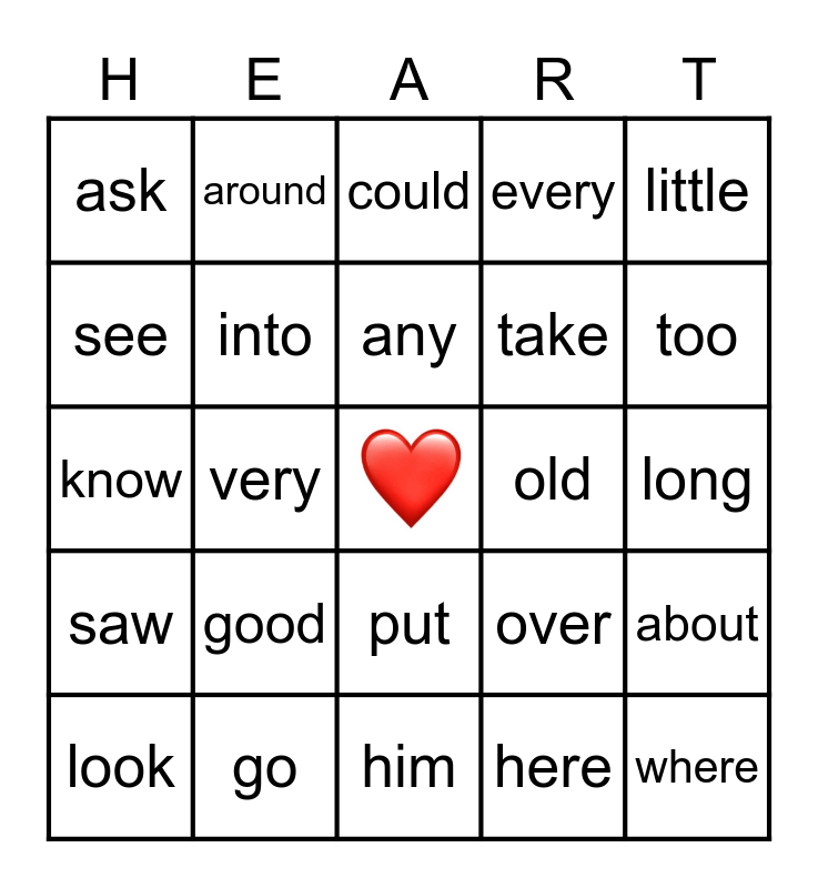 This bingo card has a free space and 24 words: good, go, any, look, little, ask, see, around, old, put, take, know, over, about, into, here, long, could, too, very, where, saw, every and him.