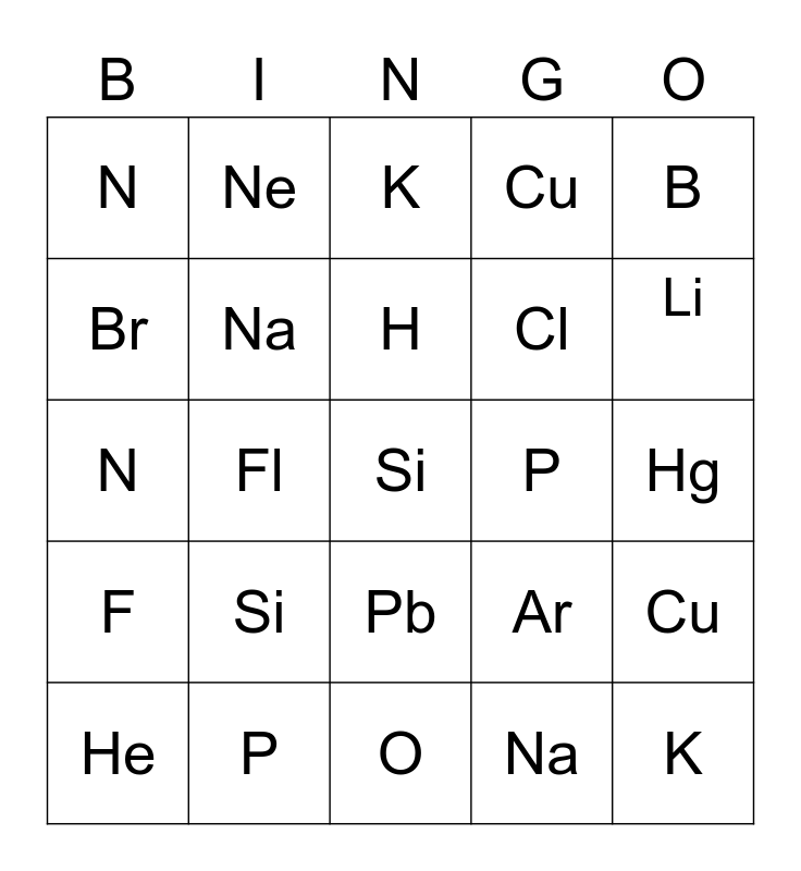This bingo card has 56 words: H, He, C, N, O, Ne, Na, Al, Cl, Fe, Cu, Ag, Au, Pb, U, Li, B, Fl, Mg, Si, P, S, Ar, K, Ca, H, He, Ni, Li, B, Sn, Be, C, Pt, Hg, Br, N, O, F, Ne, Pb, K, Mg, Al, S, Si, P, Cl, Fe, Ar, Na, Ni, Zn, Au, Cu and Ag.