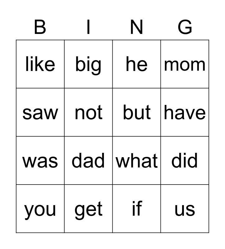 This bingo card has 16 words: get, did, he, like, was, big, what, if, saw, not, you, mom, dad, have, but and us.