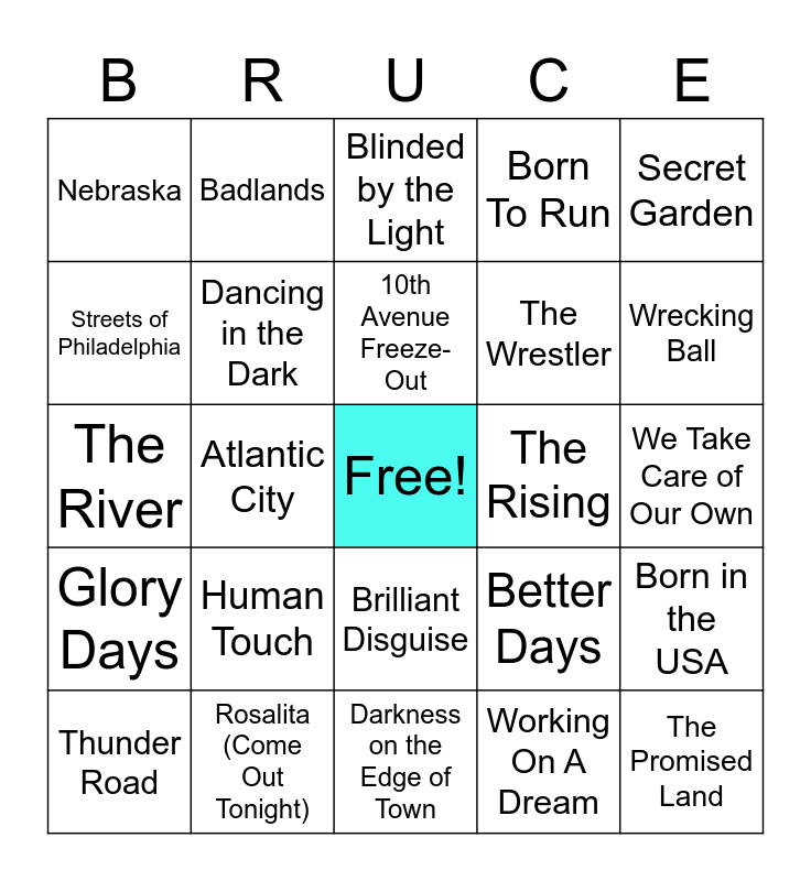 This bingo card has a free space and 24 words: Human Touch, Rosalita (Come Out Tonight), 10th Avenue Freeze-Out, Thunder Road, Secret Garden, Nebraska, Streets of Philadelphia, Badlands, The Rising, Brilliant Disguise, The Wrestler, The River, Better Days, Born in the USA, Dancing in the Dark, Working On A Dream, We Take Care of Our Own, Blinded by the Light, Wrecking Ball, Atlantic City, The Promised Land, Glory Days, Born To Run and Darkness on the Edge of Town.