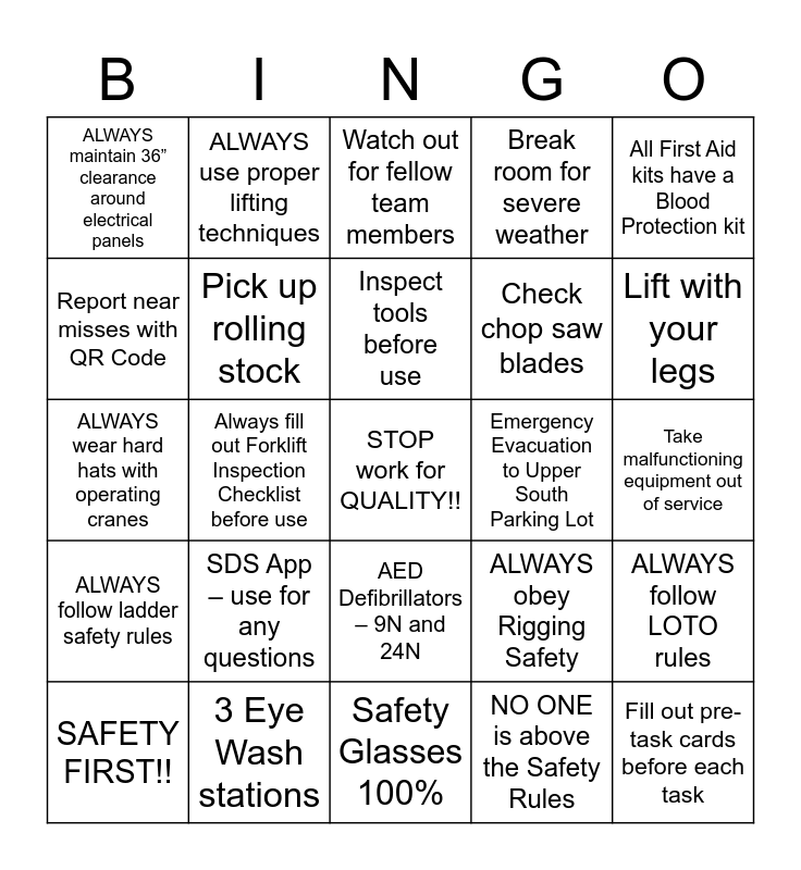 This bingo card has 44 words: STOP work for SAFETY!!, STOP work for QUALITY!!, BELIEVE IN ZERO!!, SAFETY FIRST!!, We NEVER compromise SAFETY!!, NO ONE is above the Safety Rules, Watch out for fellow team members, 7 First Aid Stations, All First Aid kits have a Blood Protection kit, 3 Eye Wash stations, Break room for severe weather, Emergency Evacuation to Upper South Parking Lot, AED Defibrillators – 9N and 24N, SDS App – use for any questions, Protective gloves 100%, Safety Glasses 100%, ALWAYS wear face shields when grinding, ALWAYS wear hard hats with operating cranes, Team lift anything over 50 lbs., Lift with your legs, ALWAYS use proper lifting techniques, If you need help just ask, Fire Extinguishers MUST ALWAYS be unobstructed, ALWAYS maintain 36” clearance around electrical panels, Take broken tools out of service, Take malfunctioning equipment out of service, ALWAYS obey Forklift Safety, ALWAYS follow Mobile Elevated Work Platform Lift Safety Rules, ALWAYS obey Rigging Safety, ALWAYS follow ladder safety rules, ALWAYS obey EOI’s (Equipment Operating Instructions), ALWAYS follow LOTO rules, ALWAYS follow hearing protection rules, NEVER leave suspended loads unattended, Always fill out Forklift Inspection Checklist before use, Always fill out Crane Inspection Checklist before use, Always fill out Vehicle Inspection Checklist before use, Fill out pre-task cards before each task, Inspect tools before use, Report near misses with QR Code, Check chop saw blades, Emergency Exits free and clear, Pick up rolling stock and Watch for slip and trip hazards.