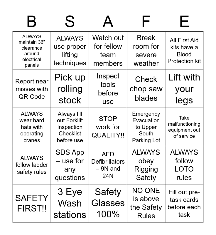 This bingo card has 44 words: STOP work for SAFETY!!, STOP work for QUALITY!!, BELIEVE IN ZERO!!, SAFETY FIRST!!, We NEVER compromise SAFETY!!, NO ONE is above the Safety Rules, Watch out for fellow team members, 7 First Aid Stations, All First Aid kits have a Blood Protection kit, 3 Eye Wash stations, Break room for severe weather, Emergency Evacuation to Upper South Parking Lot, AED Defibrillators – 9N and 24N, SDS App – use for any questions, Protective gloves 100%, Safety Glasses 100%, ALWAYS wear face shields when grinding, ALWAYS wear hard hats with operating cranes, Team lift anything over 50 lbs., Lift with your legs, ALWAYS use proper lifting techniques, If you need help just ask, Fire Extinguishers MUST ALWAYS be unobstructed, ALWAYS maintain 36” clearance around electrical panels, Take broken tools out of service, Take malfunctioning equipment out of service, ALWAYS obey Forklift Safety, ALWAYS follow Mobile Elevated Work Platform Lift Safety Rules, ALWAYS obey Rigging Safety, ALWAYS follow ladder safety rules, ALWAYS obey EOI’s (Equipment Operating Instructions), ALWAYS follow LOTO rules, ALWAYS follow hearing protection rules, NEVER leave suspended loads unattended, Always fill out Forklift Inspection Checklist before use, Always fill out Crane Inspection Checklist before use, Always fill out Vehicle Inspection Checklist before use, Fill out pre-task cards before each task, Inspect tools before use, Report near misses with QR Code, Check chop saw blades, Emergency Exits free and clear, Pick up rolling stock and Watch for slip and trip hazards.