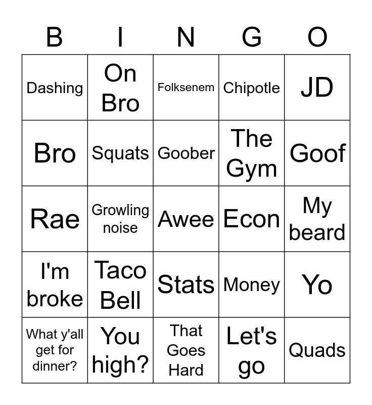 This bingo card has 25 words: Taco Bell, That Goes Hard, Goober, What y'all get for dinner?, JD, Dashing, Bro, On Bro, Econ, Stats, The Gym, Rae, Money, Yo, Squats, Quads, My beard, Folksenem, Goof, Growling noise, Awee, You high?, I'm broke, Chipotle and Let's go.