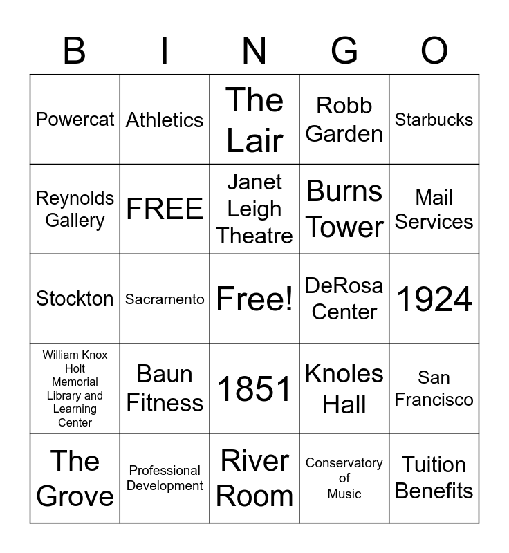 This bingo card has a free space and 25 words: Baun Fitness, River Room, Janet Leigh Theatre, The Grove, Starbucks, Powercat, Reynolds Gallery, Athletics, DeRosa Center, 1851, Burns Tower, Stockton, Knoles Hall, San Francisco, FREE, Bookstore, 1924, The Lair, Mail Services, Sacramento, Tuition Benefits, Professional Development, William Knox Holt Memorial Library and Learning Center, Robb Garden and Conservatory of Music.