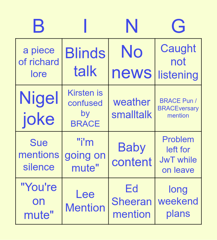 This bingo card has 16 words: "You're on mute", Lee Mention, No news, Caught not listening, Nigel joke, Blinds talk, Baby content, Problem left for JwT while on leave, a piece of richard lore, Kirsten is confused by BRACE, Ed Sheeran mention, BRACE Pun / BRACEversary mention, Sue mentions silence, "i'm going on mute", weather smalltalk and long weekend plans.