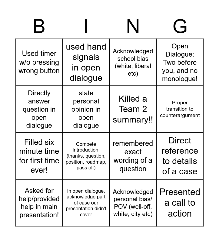 This bingo card has 17 words: Acknowledged personal bias/ POV (well-off, white, city etc), Asked for help/provided help in main presentation!, Acknowledged school bias (white, liberal etc), Used timer w/o pressing wrong button, Compete Introduction! (thanks, question, position, roadmap, pass off), Open Dialogue: Two before you, and no monologue!, Direct reference to details of a case, Killed a Team 2 summary!!, Proper transition to counterargument, state personal opinion in open dialogue, In open dialogue, acknowledge part of case our presentation didn't cover, remembered exact wording of a question, Directly answer question in open dialogue, used hand signals in open dialogue, Filled six minute time for first time ever!, Perfect Outro! (question, conclusion, call to action, thanks) and Presented a call to action.