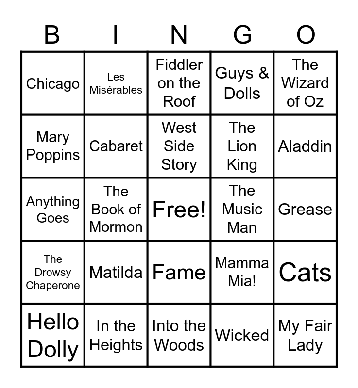 This bingo card has 50 words: Legally Blonde, The Sound of Music, The Phantom of the Opera, Wicked, Grease, Singin' in the Rain, Les Misérables, Hamilton, The Lion King, My Fair Lady, Chicago, Cabaret, Free!, Mamma Mia!, Hairspray, Rent, The Book of Mormon, West Side Story, Dreamgirls, The Wizard of Oz, Mary Poppins, Little Shop of Horrors, Fiddler on the Roof, The Music Man, Sweeney Todd, Miss Saigon, Matilda, Annie, Guys & Dolls, Cats, Evita, Gypsy, A Chorus Line, Oklahoma, Hello Dolly, High School Musical, Into the Woods, Urinetown, 9 to 5, Anything Goes, The 25th Annual Putnam County Spelling Bee, Charlie & the Chocolate Factory, Newsies, Seussical, The Drowsy Chaperone, In the Heights, Fame, Moulin Rouge, Aladdin and Shrek.