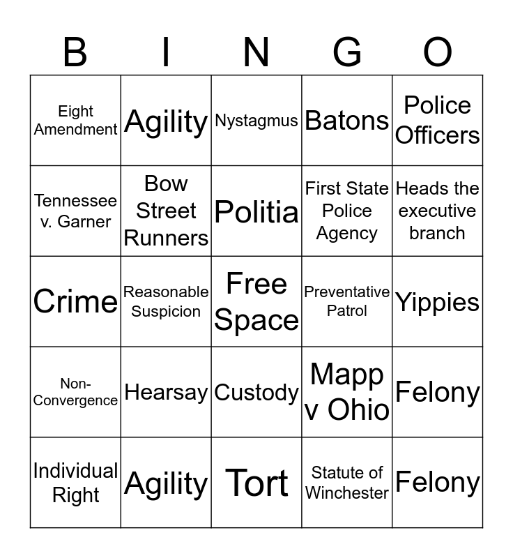 This bingo card has a free space and 24 words: Hearsay, Agility, Politia, Individual Right, Police Officers, Eight Amendment, Tennessee v. Garner, Agility, Preventative Patrol, Custody, First State Police Agency, Crime, Mapp v Ohio, Felony, Bow Street Runners, Statute of Winchester, Yippies, Nystagmus, Heads the executive branch, Reasonable Suspicion, Felony, Non-Convergence, Batons and Tort.