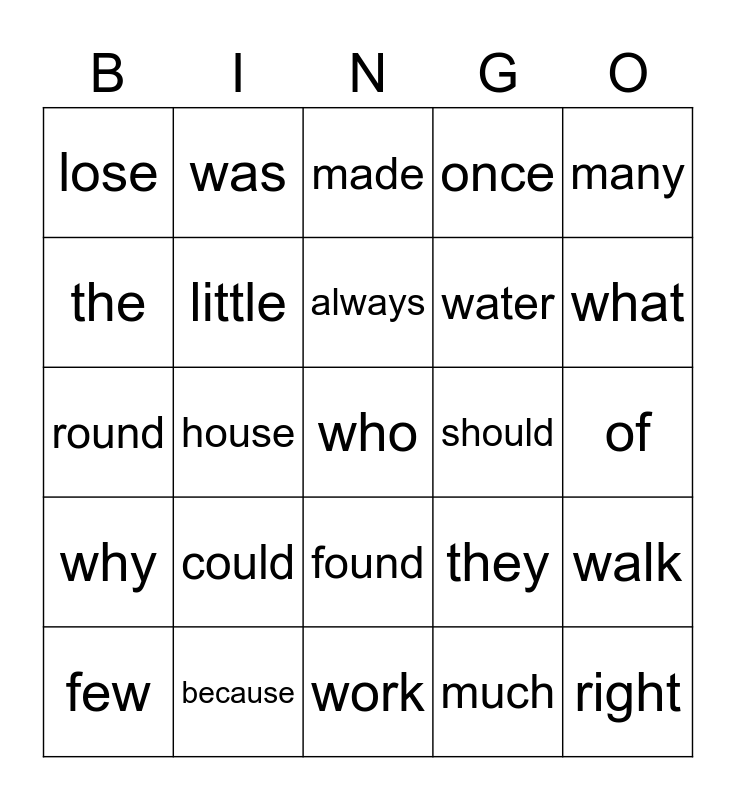 This bingo card has a free space and 24 words: could, because, always, few, many, lose, the, was, should, found, water, round, they, walk, little, much, of, made, what, house, right, why, once and work.
