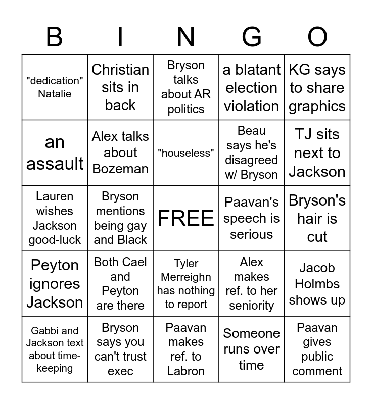This bingo card has a free space and 31 words: Paavan makes ref. to Labron, Logan Wilson says something about jet skis, Bryson mentions being gay and Black, Stephanie claims the x-walk bill, "dedication" Natalie, Bryson talks about AR politics, Alex talks about Bozeman, Alex makes ref. to her seniority, Paavan's speech is serious, Someone runs over time, Bryson's hair is cut, Paavan gives public comment, Lucas proxies, "Vision" Jackson, TJ sits next to Jackson, "representation" or "diversity" -Bryson, Jacob Holmbs shows up, Both Cael and Peyton are there, Peyton ignores Jackson, Tyler Merreighn has nothing to report, KG says to share graphics, Tyler has meet-cure with Danny, Gabbi and Jackson text about time-keeping, Christian sits in back, Beau says he's disagreed w/ Bryson, an assault, a blatant election violation, Lauren wishes Jackson good-luck, Bryson says you can't trust exec, "houseless" and "neutral" Matt.