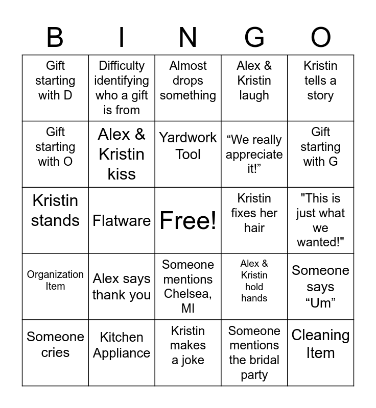 This bingo card has a free space and 24 words: Alex says thank you, Kitchen Appliance, Yardwork Tool, Someone cries, Kristin tells a story, Gift starting with D, Gift starting with O, Difficulty identifying who a gift is from, Kristin fixes her hair, Someone mentions Chelsea, MI, “We really appreciate it!”, Kristin stands, Alex & Kristin hold hands, Someone says “Um”, Alex & Kristin kiss, Someone mentions the bridal party, "This is just what we wanted!", Almost drops something, Gift starting with G, Flatware, Cleaning Item, Organization Item, Alex & Kristin laugh and Kristin makes a joke.