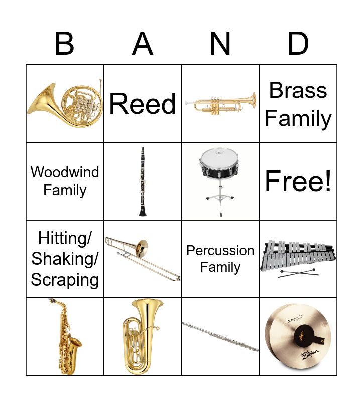 This bingo card has 10 images and 7 words: Brass Family, Free!, Percussion Family, Woodwind Family, Reed, Hitting/ Shaking/ Scraping and Buzzing Lips.