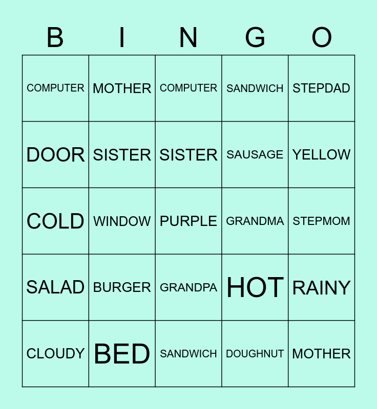 ⚠ This card has duplicate items: SUNNY (2), CLOUDY (2), RAINY (2), HOT (2), COLD (2), MOTHER (2), FATHER (2), SISTER (2), GRANDMA (2), GRANDPA (2), BROTHER (2), STEPMOM (2), STEPDAD (2), BED (2), DOOR (2), WINDOW (2), COMPUTER (2), SHOWER (2), SAUSAGE (2), BURGER (2), SALAD (2), SANDWICH (2), DOUGHNUT (2), ORANGE JUICE (2), TOMATO (2), RED (2), BLUE (2), YELLOW (2), GREEN (2), PURPLE (2), BLACK (2), PINK (2), ORANGE (2)