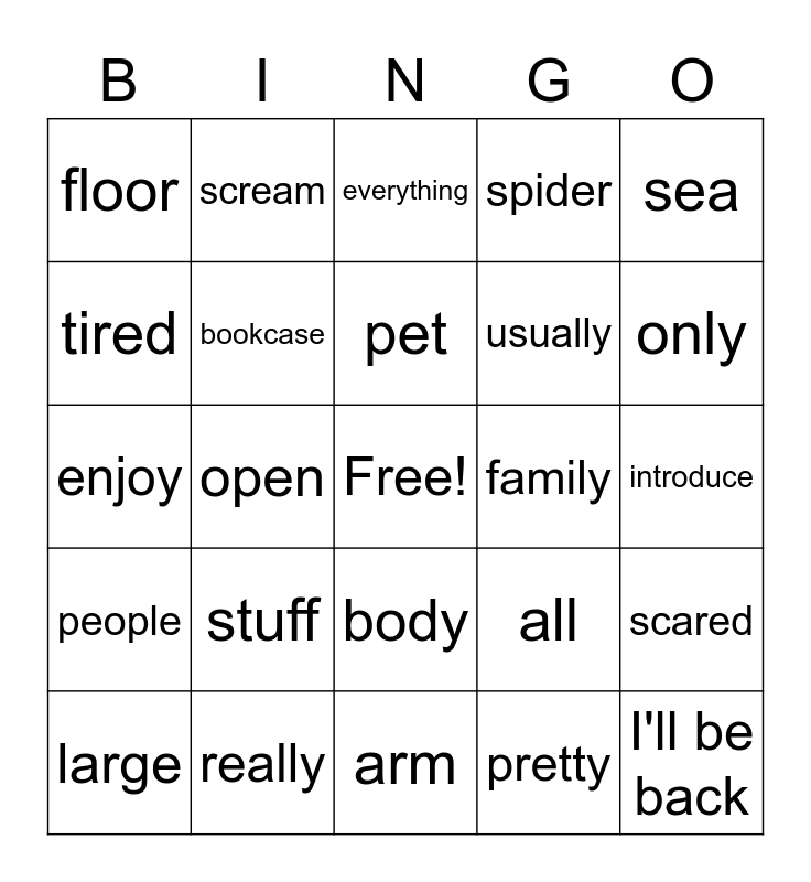 This bingo card has a free space and 29 words: large, get to, open, wall, floor, everything, bookcase, stuff, family, really, introduce, I'll be back, arm, pretty, only, spot, body, people, sea, enjoy, all, kind and happy, usually, tired, spider, scream, scared, pet and because.