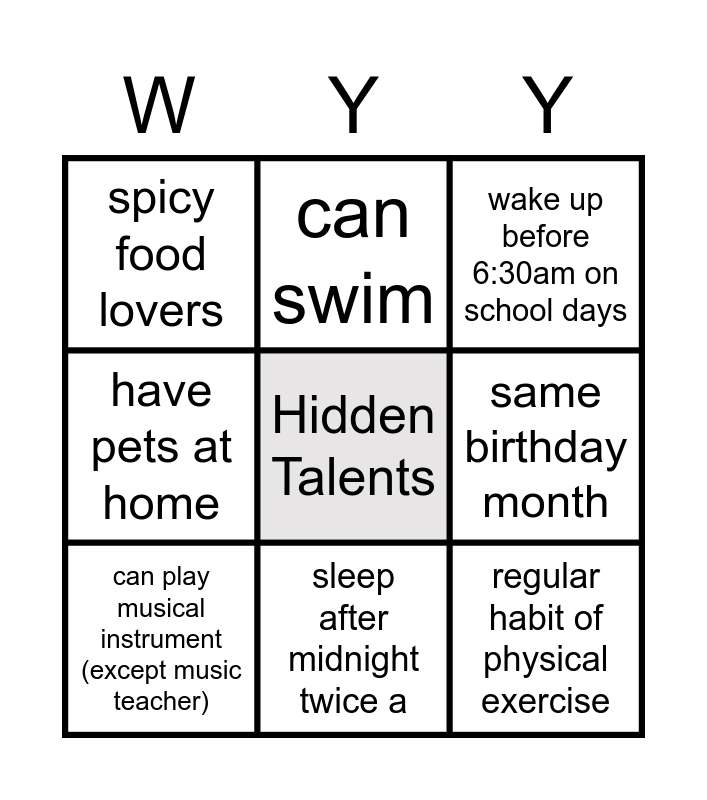 This bingo card has a free space and 8 words: same birthday month, wake up before 6:30am on school days, can swim, can play musical instrument (except music teacher), spicy food lovers, regular habit of physical exercise, have pets at home and sleep after midnight twice a.