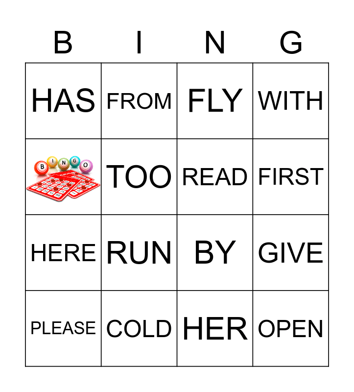 This bingo card has 1 images and 15 words: COLD, GIVE, FLY, HAS, HERE, FROM, BY, HER, TOO, PLEASE, WITH, RUN, FIRST, READ and OPEN.