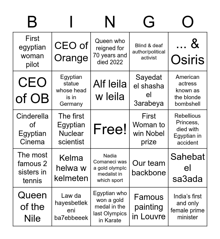 This bingo card has a free space and 24 words: Kelma helwa w kelmeten, Law da hayesbetlek eni ba7ebbeeek, Alf leila w leila, Queen of the Nile, ... & Osiris, First egyptian woman pilot, CEO of OB, CEO of Orange, First Woman to win Nobel prize, Nadia Comaneci was a gold olympIc medalist in which sport, Sayedat el shasha el 3arabeya, Cinderella of Egyptian Cinema, Our team backbone, Sahebat el sa3ada, Egyptian statue whose head is in Germany, Famous painting in Louvre, Rebellious Princess, died with Egyptian in accident, Queen who reigned for 70 years and died 2022, American actress known as the blonde bombshell, The first Egyptian Nuclear scientist, India’s first and only female prime minister, The most famous 2 sisters in tennis, Blind & deaf author/political activist and Egyptian who won a gold medal in the last Olympics in Karate.