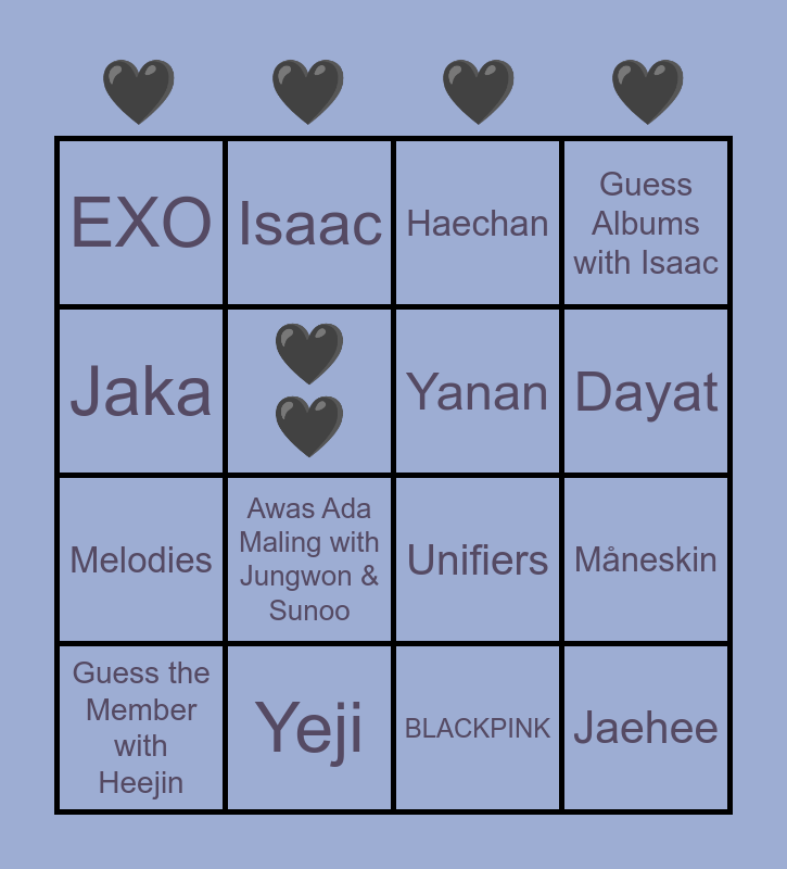 This bingo card has 16 words: Guess the Member with Heejin, Yeji, Haechan, Guess Albums with Isaac, Jaka, Isaac, Unifiers, MΓ₯neskin, EXO, π€π€, BLACKPINK, Dayat, Melodies, Awas Ada Maling with Jungwon & Sunoo, Yanan and Jaehee.