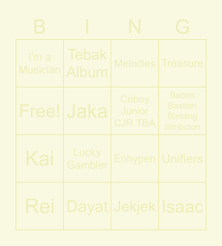 This bingo card has 16 words: Dayat, Unifiers, Melodies, I'm a Musician, Kai, Tebak Album, Enhypen, Jekjek, Free!, Jaka, Rei, Treasure, Lucky Gambler, Babas Bastian Bintang Simbolon, Coboy Junior CJR TBA and Isaac.