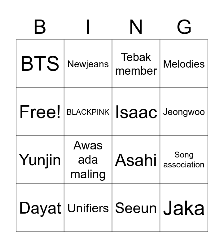 This bingo card has 16 words: Unifiers, Song association, Tebak member, BTS, Yunjin, Newjeans, Asahi, Seeun, Free!, BLACKPINK, Dayat, Melodies, Awas ada maling, Jeongwoo, Isaac and Jaka.