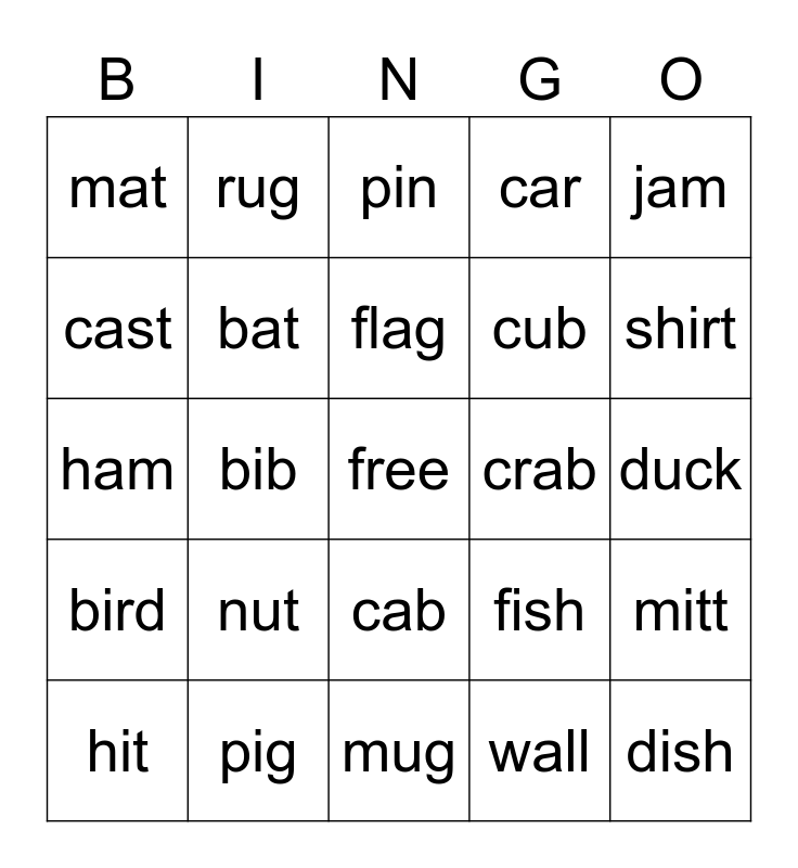 This bingo card has a free space and 35 words: ant, bag, ball, bat, cab, car, cast, cat, flag, glass, ham, jam, hat, map, mat, crab, wall, bib, bird, dish, fish, hit, mitt, pig, pin, shirt, bug, bus, cub, duck, gum, mug, nut, rug and tub.