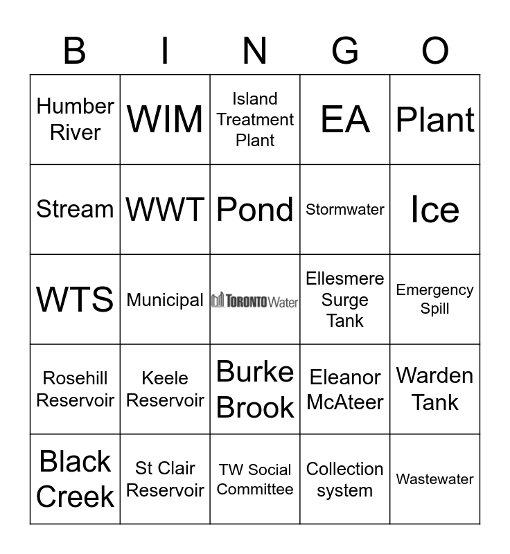 This bingo card has a free space and 75 words: RC Harris, RL Clark, Island Treatment Plant, Ashbridges Bay, Humber Treatment Plant, Highland Creek, Highlevel Pumping Station, FJ Horgan, Lake Ontario, Toronto, Sewer, Clean, Pond, Stream, Drinking, Municipal, Potable, Wastewater, Rainwater, Plant, Treatment, WTS, WWT, WIM, EA, DC, GMO, CTS, SPWD, Pipes, Richard Noehammer, Chlorine, Rain, Eleanor McAteer, Ice, Stormwater, Lead, GIS, Emergency Spill, Collection system, Watermain, Project Management, Contracts, Payments, Water Meter, North Toronto, Black Creek, Humber River, Don River, Etobicoke Creek, Mimico Creek, Burke Brook, Taylor-Massey Creek, Rouge River, West Highland Creek, Lou Di Gironimo, William Shea, William Fernandes, Lawson Oates, Frank Quarisa, Keele Reservoir, Lawrence Reservoir, Ellesmere Reservoir, Scarborough Reservoir, Richview Reservoir, Ellesmere Surge Tank, Whitman Tank, Leslie Tank, Eglinton Reservoir, Warden Tank, Rosehill Reservoir, St Clair Reservoir, Rouge Tank, TW Social Committee and Strategic Plan.